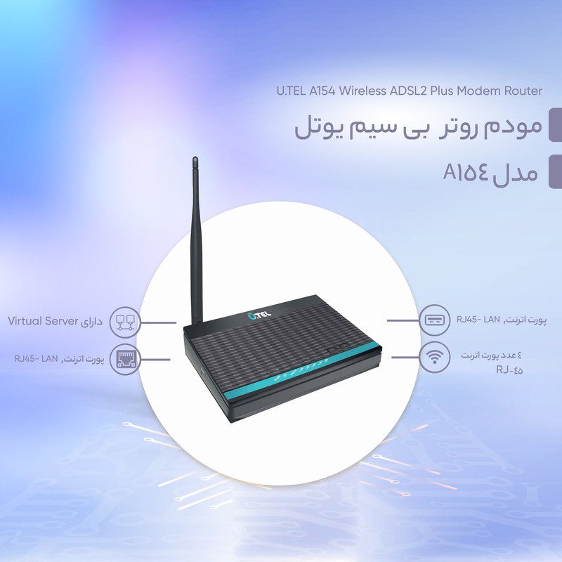 مودم روتر A154 ساخت برند یوتل بوده که یک برند کاملا ایرانی است. این مودم توان برقراری ارتباط با اینترنت تا سرعت 24 مگابیت در ثانیه را برای دریافت (دانلود) و با سرعت 2 مگابیت در ثانیه را برای ارسال (آپلود) اطلاعات ارائه میدهد و هم چنین توانایی ایجاد شبکه بی سیم (wifi) را با سرعت انتقال داده 150 مگابیت در ثانیه را دارد. این دستگاه دارای یک درگاه تلفن و چهار درگاه اتصال شبکه بوده و از طریق رابط کاربری مناسب به صورت web-based قابل کنترل است. مودم U.TEL A154 به منظور اشتراک گذاری اینترنت پرسرعت در مصارف خانگی و سازمانهای کوچک طراحی شده است و با به کارگیری استانداردها و قابلیتهای کلیدی، یک انتخاب قابل قبول و ایده آل است.