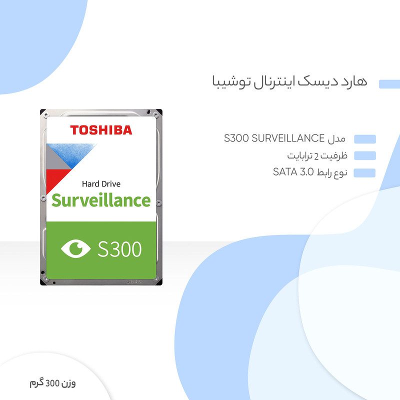 هارددیسک اینترنال توشیبا مدل S300 ظرفیت 2 ترابایت از تولیدات شرکت «توشیبا» (toshibal) است. این مدل در خانواده‌ سورویلانس (s300) سازنده جای می‌گیرد و برای استفاده از سیستم‌های حفاظتی ساخته شده‌ است. هارددیسک اینترنال توشیبا مدل S300 ظرفیت 2 ترابایت به‌صورت کاملاً اختصاصی برای برخورداری از سرعت، ظرفیت و حفظ طولانی‌مدت محتویات طراحی و توسعه پیدا کرده و به عنوان محصولاتی قابل‌اطمینان برای سیستم‌های نظارتی و استفاده 24/7 به شمار می‌روند. این سری از درایوهای ذخیره‌ساز اطلاعات از توانایی لازم برای پشتیبانی از تعداد 32 دوربین دارای وضوح تصویر بالا برخوردار بوده و قادر به فراهم آوردن شرایطی هستند تا امکان دسترسی به‌تمامی فریم‌ها با حداکثر کیفیت میسر باشد.هارددیسک به عنوان یکی از اصلی‌ترین قطعات موجود در سیستم‌های نظارتی – امنیتی از اهمیت بسیار بالایی برخوردار بوده و قابلیت اطمینان 24/7 و کارایی بالا ازجمله لازمه‌های اساسی آن‌ها به شمار می‌روند که تمامی موارد مربوطه توسط دیسک‌های سخت‌سری S300 کمپانی توشیبا به ارمغان آورده شده‌اند. این سری از محصولات از 128 مگابایت حافظه بافر بهره برده و بهینه‌سازی تخصیص سیکل‌های خوانش و نوشت اطلاعات توسط فناوری Dynamic Cache کمپانی توشیبا و الگوریتم‌های تخصصی مدیریت بافر به انجام می‌رسد که این مزیت در دیگر هارددیسک‌های رده معمولی وجود ندارد.