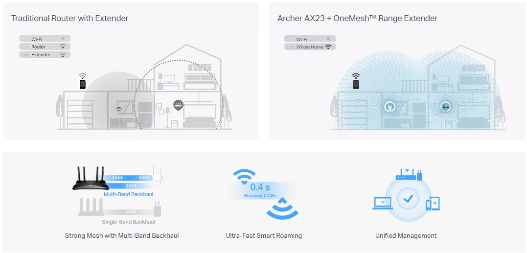 آیا می خواهید یک وای فای کل خانه بسازید؟ روتر Archer AX23 از OneMesh برای ایجاد پوشش یکپارچه در سرتاسر خانه شما پشتیبانی می کند و از افت و تاخیر هنگام حرکت بین سیگنال ها جلوگیری می کند.