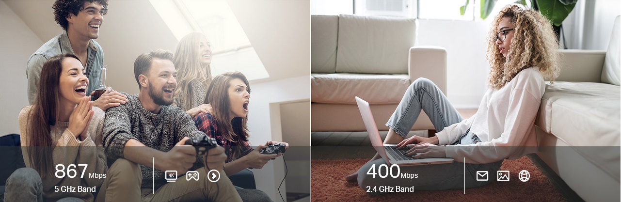 روتر بی سیم Archer C64 به شما این امکان را می دهد که دستگاه های بیشتری را به هم متصل کنید و با دو باند 2.4 گیگاهرتز و 5 گیگاهرتز به طور همزمان استریم کنید. باند 2.4 گیگاهرتز اتصالات قابل اعتمادی را برای ارسال ایمیل، مرور وب و سایر کارهای ساده فراهم می کند. باند 5 گیگاهرتز سرعتی تا 867 مگابایت را ارائه میکند که برای برنامههای فشرده رسانهای مانند پخش ویدیو و بازی آنلاین عالی است. با اتصال بدون تاخیر، دیگر هرگز فرصت را از دست نخواهید داد.