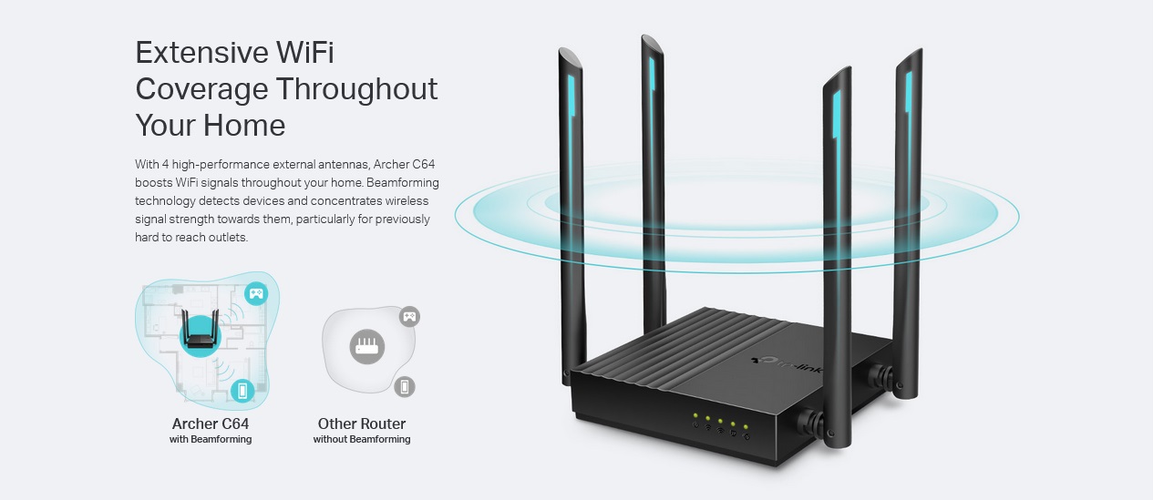 با 4 آنتن خارجی با کارایی بالا، روتر Archer C64 سیگنال های WiFi را در سراسر خانه شما تقویت می کند. فناوری Beamforming دستگاهها را تشخیص میدهد و قدرت سیگنال بیسیم را به سمت آنها متمرکز میکند، بهویژه برای پریزهایی که قبلاً دسترسی به آنها سخت بود.