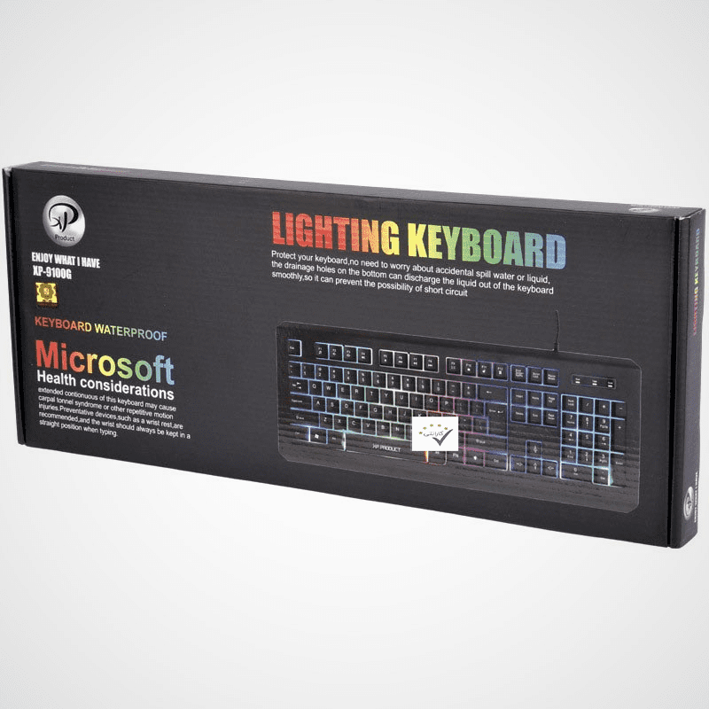دارای سه چراغ LED است که برای اعلان روشن یا خاموش بودن کلیدهای Num Lock، Caps Lock و Scroll Lock می باشد. روی کلیدهای کیبورد xp مدل 9100 حروف فارسی حک شده تا کاربر به راحتی بتواند کلیدهای فارسی را از هم تشخیص بدهد. همچنین این کیبورد مجهز به نورپردازی پس زمینه بک لایت است که باعث می شود جلوه ی بسیار زیبایی به این کیبورد ببخشد.